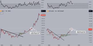 Attached is a comparable chart of Bitcoin's price movement, showing similar chart action from 2018. We are on the verge of a similar price move.